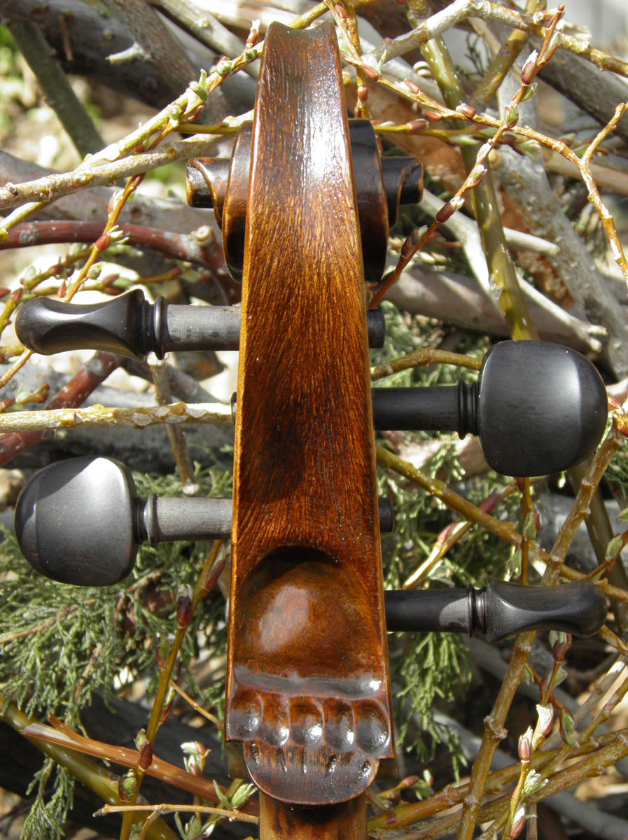"The Bear" Baritone Cello was finished in 1998 and is the largest cello I have made. Currently it is strung as a baroque instrument which allows its deep and mellow tone to fill a hall. The sound seems to magically bloom. It measures 51 and 1/4 inches in the entire length, body length 32 and 7/8ths inches with a string length of 68.6 cm or 27 inches. The top bout is 14 and 15/16ths inches, the center bout 10 and 13/16ths inches and the bottom bout 20 and 1/8ths inches. I kept the neck narrow making this instrument easy to play in spite of its large size.