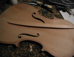 "ff" hole is completely cut out. Notice how smooth the wood is cut after cleaning up the rough edges left by the sawing process. The final clean-up is done with a very sharp knife.