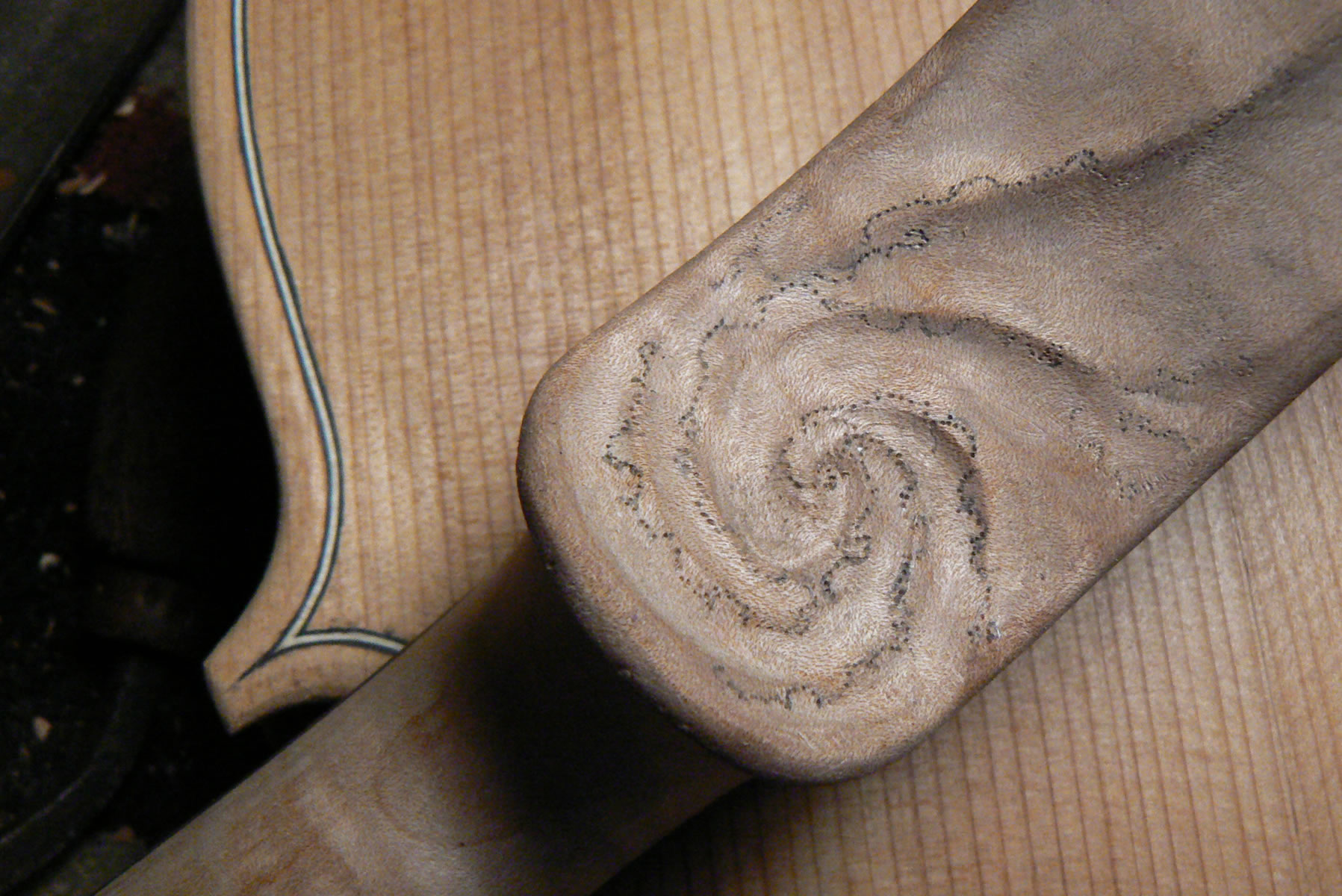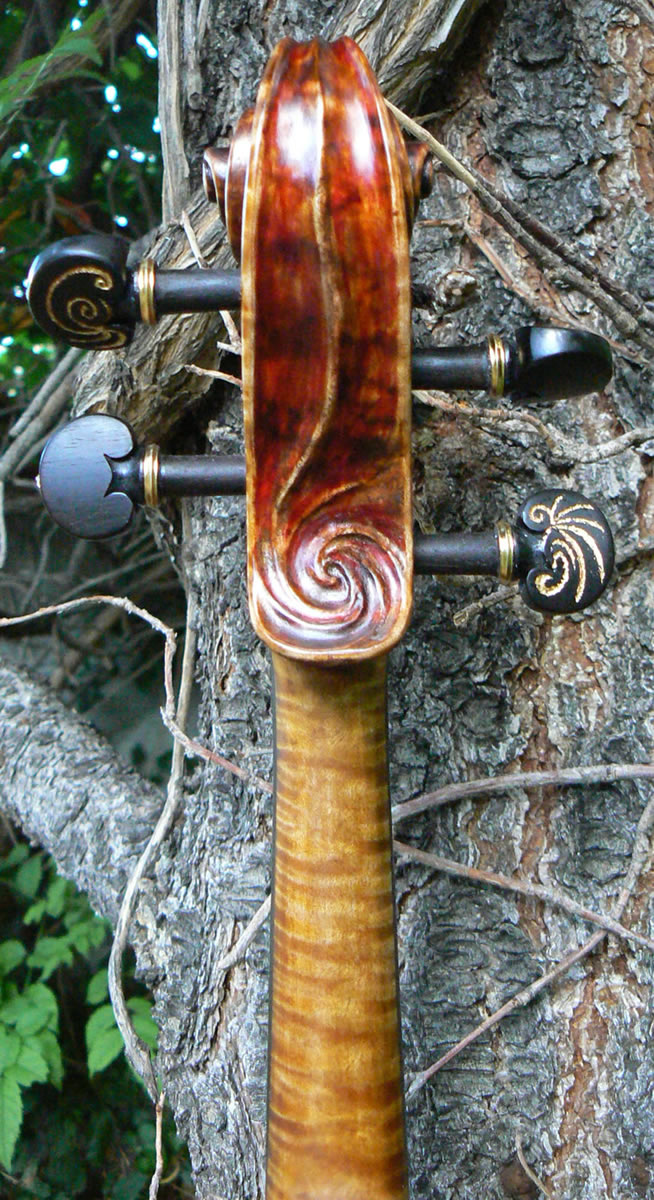 "Kosmo," the violin, was made for one of the premier violinists, Lester Kong, of Singapore. He asked for a theme truly cosmic in nature: a galaxy on the back of the scroll with a comet streaking across the universe seeding music as the roaming wanderer drifts over the mountains of an known world. The tailpiece and pegs also carry along with the theme as does the fusion of tone, light and dark, energized with brilliance.